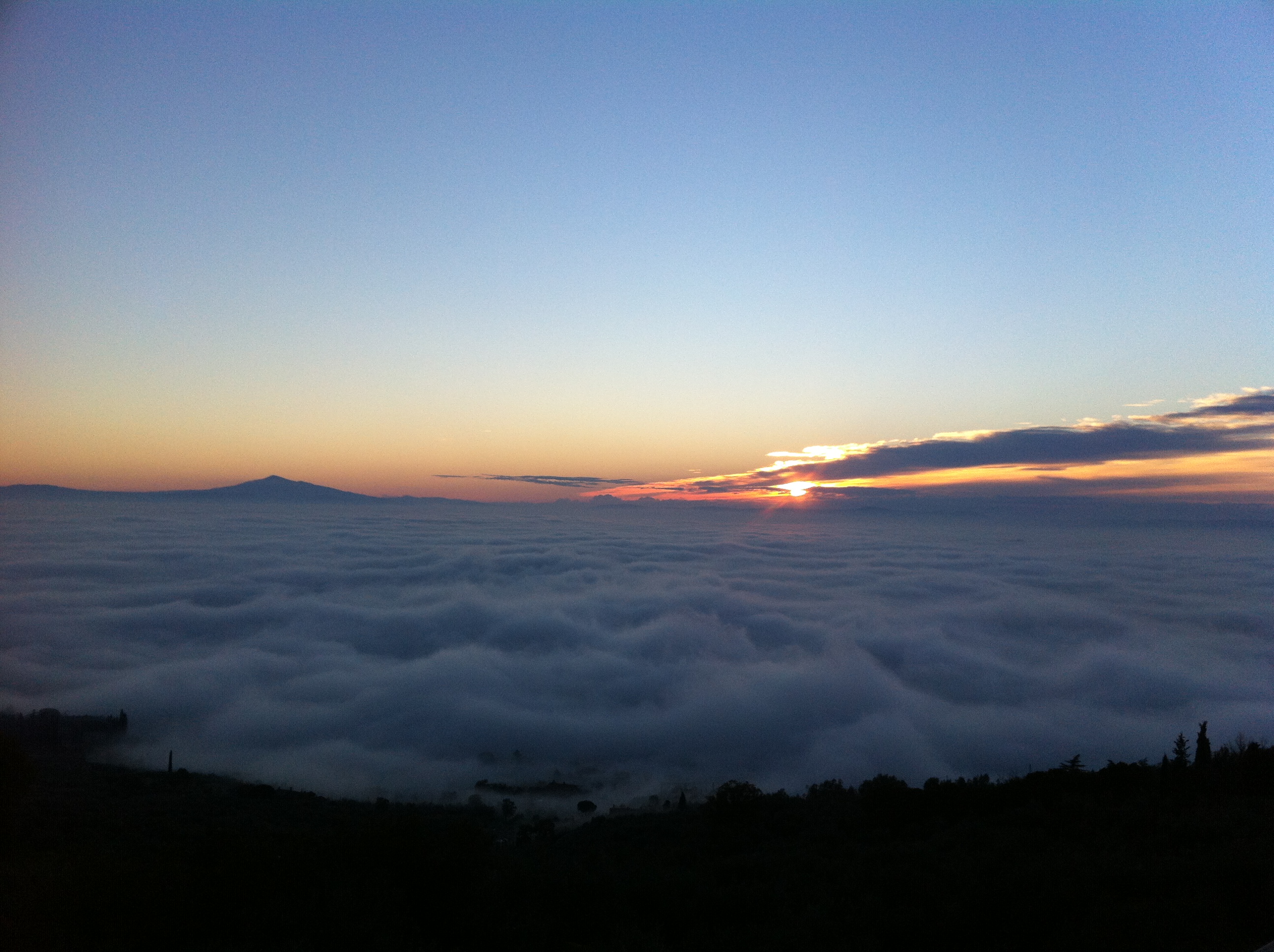Cortona, situated on the border of Tuscany and Umbria, is perched quite high upon a hill with a wide and long valley just below it, and hills and mountains fanning out behind it. I actually was not aware of just how high up it was until we began zigzagging to the top. Almost as quickly as it had blanketed us, so did the dense fog begin to thin out and lift. Forms began to immerge. Country houses and olive trees became distinguishable. Rays of sun pierced through the clouds, cracking their heaviness and breaking them open. Everything shifted once again, including my mood. As we continued, the sun shone stronger and the hazy sky turned brighter. In that moment, I realized that it was not actually the weather that was changing but our ascent, our moving through the unwanted to reach to the destination, which was causing the change. The valley had provided us with a vastly different experience. It was as opposite as night and day. Reaching the top, light completely surrounded us and Cortona welcomed us.